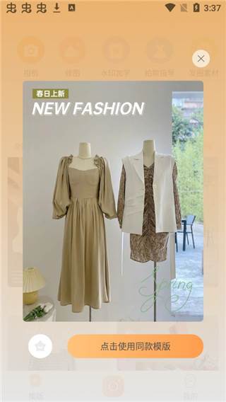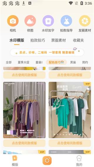 2、在模板中可以看到有很多水印模板,以及拍款技巧、票圈素材等;
